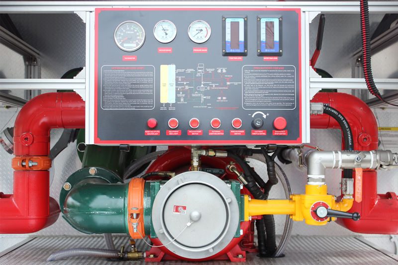 â–² نظام مضخة الحريق:تم تجهيز السيارة بمضخة حريق عالية الأداء CB10/60بتدفق مُصنّف يصل إلى 60 لترًا/ثانية وضغط تشغيل أقصى يبلغ 1.232 ميجا باسكال، تضمن مضخة المياه هذه تلبية احتياجات إمدادات المياه لمسافات طويلة وبتدفق كبير. تعتمد مضخة المياه على تصميم طرد مركزي ثنائي المراحل، مع قدرة تحضير ذاتي قوية وتشغيل مستقر. يمكنها تحقيق ضغط ماء مستقر بسرعة حتى عمق 7 أمتار.