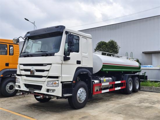 HOWO HW76, NX cabin is optionalشاحنة نقل المياه HOWO 6×4 هي مركبة صرف صحي صديقة للبيئة متعددة الوظائف، مُعدّلة على هيكل SINOTRUK HOWO ZZ1257 6×4. وهي مُجهزة بخزان مياه من الفولاذ الكربوني سعة 20,000 لتر، ومضخة مياه من نوع 80QZ60/90، ونظام رش. تعمل المركبة باستخدام مضختها المُدمجة لتجهيز المياه ذاتيًا من مصادر خارجية، ثم نقلها تحت ضغط إلى رشاشات أمامية/خلفية/جانبية ومدفع مياه بمدى ≥35 مترًا، مما يُتيح أوضاع رش مُتنوعة.