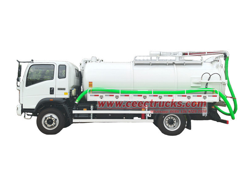 شاحنة الصرف الصحي ذات المحور الواحد Howo 5000 لتر (وتسمى أيضًا شاحنة مضخة الشفط الفراغي Howo 5cbm ، وشاحنة صهريج التفريغ Howo 5000 لتر ، وشاحنة مضخة خزان الصرف الصحي Howo 4x2 ، وشاحنة مضخة الصرف الصحي Howo 6 عجلات ، وشاحنة شفط مياه الصرف الصحي الفراغية Howo.) يُستخدم لجمع ونقل وتصريف السوائل، مثل المياه الملوثة والرواسب الطينية وخزانات الصرف الصحي. تمت معالجة هيكل الخزان بطبقة مقاومة للتآكل والصدأ، مما يجعله متينًا للغاية. مزودًا بمضخة تفريغ عالية الطاقة، يتميز بقوة شفط عالية، وهو جهاز احترافي لا غنى عنه في مجال الحوكمة البيئية الحضرية والريفية.