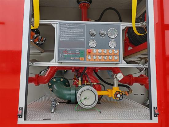 تُدار مضخة الحريق بواسطة محوّل طاقة (PTO)، بنطاق ضغط يتراوح بين 1.6 و2.5 ميجا باسكال، ومعدل تدفق يتراوح بين 80 و120 كجم/ثانية. يتميز مدفع الحريق بسرعة رش تتراوح بين 60 و100 كجم/ثانية، ويصل مداه إلى 40-60 مترًا، مما يُمكّنه من الاستجابة بفعالية لمختلف حالات الحريق.