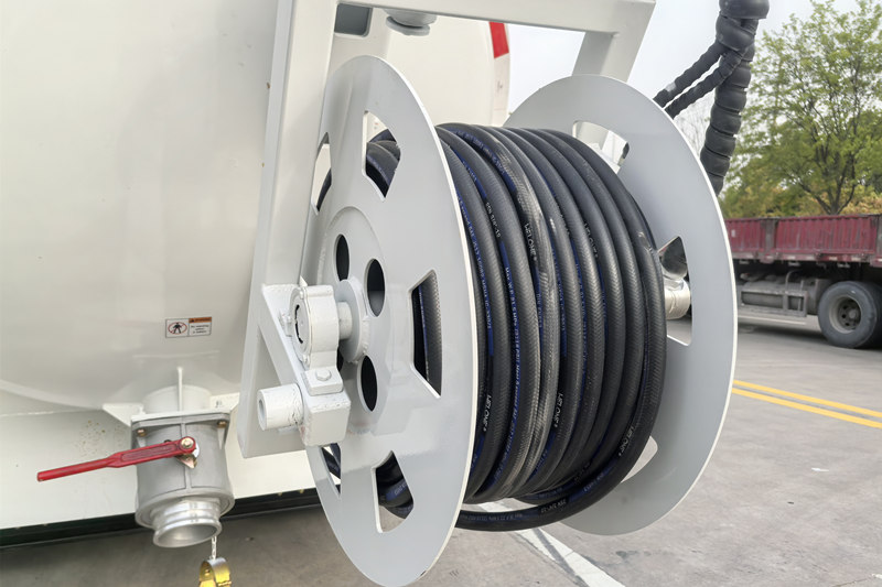 هيكل خزان المركبة مصنوع من فولاذ كربوني عالي الجودة Q355. الأسطوانة والرأس ملحومان بلحامات مستقيمة من صفائح فولاذية كربونية بسمك 6 مم.هيكل الخزان متين. جسم الخزان مصنوع من مادة مقاومة للتآكل، ومجهز بجهاز إنذار لمستوى السائل وجهاز تفريغ سريع.