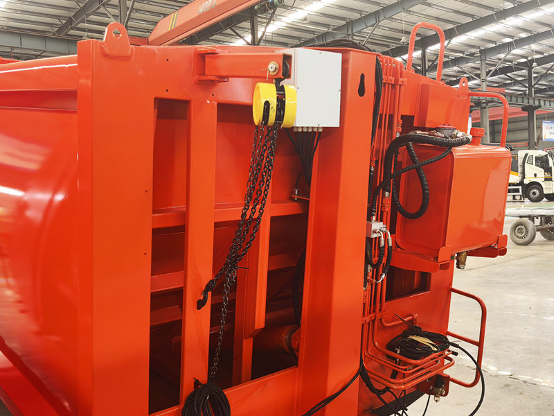 صُنعت أطقم الهيكل العلوي لضاغط النفايات الخلفي من صفائح فولاذية ملحومة عالية القوة، مما يوفر هيكلًا متينًا ومتينًا مع عزل ممتاز، ويمنع تسرب مياه الصرف الصحي والروائح بفعالية. أما الجزء الداخلي، فهو معالج بطبقة مانعة للتآكل والصدأ، ومجهز بآلية ضغط عالية الكفاءة، مما يقلل حجم النفايات بشكل كبير ويحسن كفاءة التحميل. تبلغ سعة الهيكل العلوي 8 أمتار مكعبة، ويدعم طرق تحميل وتفريغ متعددة لتلبية مختلف الاحتياجات التشغيلية.