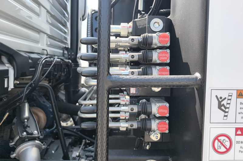 ● تستخدم شاحنة الضاغط ذات التحميل الخلفي من شاكمان صمامات تحكم كهروهيدروليكي ونظام تحكم قابل للبرمجة PLC، ما يجمع بين مزايا التحكم الإلكتروني والهيدروليكي. يُحسّن هذا التحكم الكهروهيدروليكي المتكامل من كفاءة التفاعل بين النظامين الهيدروليكي والكهربائي، مما يُحسّن موثوقية التشغيل.